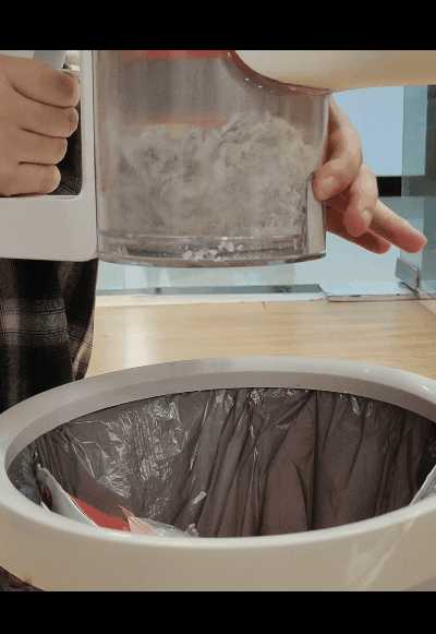 另外,垃圾吸滿之后,可以一鍵開啟集塵盒艙蓋,不用取下塵杯。