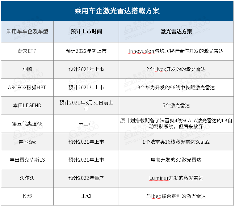 乘用車(chē)企激光雷達(dá)搭載方案,蓋世汽車(chē)整理