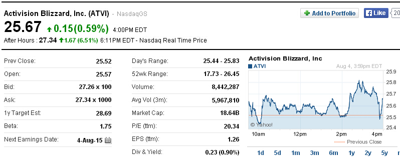 暴雪股價鳳凰科技訊北京時間8月5日消息,游戲廠商暴雪今天發布了該公司截至6月30日的2015年第二季度財報。財報顯示,基于美國通用會計準則...