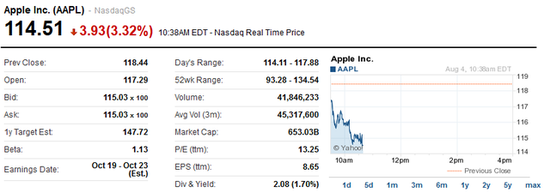 周一,蘋果股價收報118.19美元,下挫2.5%,跌至今年1月以來低位。蘋果股價自2013年9月以來首次跌破200日移動均線,200日均線往往被認(rèn)為是支撐股價的技術(shù)指標(biāo)。蘋果市值年初超過7000億美元時,庫克曾認(rèn)為中國市場功不可沒。但二季度在中國銷量不及預(yù)期,也拖累了蘋果股價。