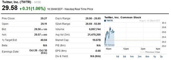 此前Twitter二季度財(cái)報令市場失望,導(dǎo)致該公司股價暴跌。周一,Twitter收盤價跌至歷史最低點(diǎn),市場普遍對該公司增長前景感到擔(dān)憂。周一該公司股價收盤下跌超過5.5%,至29.27美元,并在盤中一度跌破29美元,跌幅超過6%,不過仍高于發(fā)行價每股26美元。上周,Twitter股價累計(jì)跌幅已達(dá)到15%。