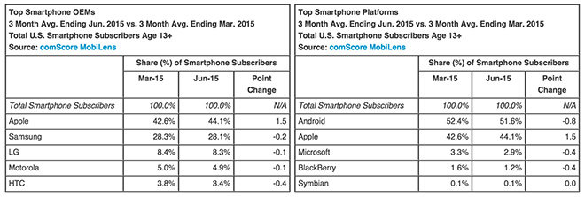 報(bào)告顯示,在截至6月的三個(gè)月內(nèi),蘋果美國(guó)智能機(jī)份額為44.1%,較上一季度的42.6%增長(zhǎng)1.5個(gè)百分點(diǎn)。三星、LG、摩托羅拉以及htc排在2到5位,市場(chǎng)份額均出現(xiàn)了小幅下滑,表明蘋果正在蠶食Android手機(jī)廠商的份額。