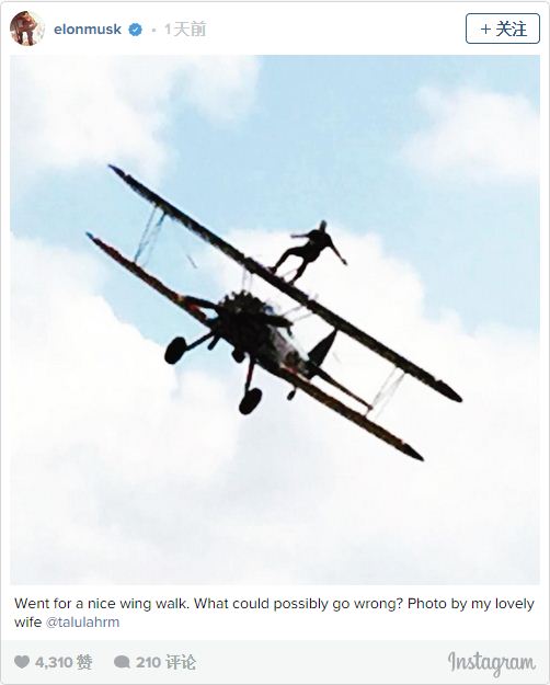 馬斯克在Instagram上發(fā)布的機(jī)翼行走照片鳳凰科技訊北京時(shí)間8月10日消息,據(jù)科技網(wǎng)站Mashable報(bào)道,周末怎么過?漂流?太不刺激了。攀巖?開玩笑...