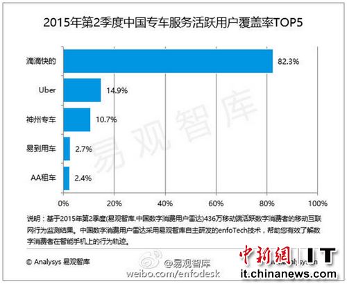 易觀國際本次發布的數據顯示,在絕對數量上,滴滴快的以覆蓋以110個城市位列專車服務覆蓋城市數首名,并以82.3%的比例占據中國專車服務活躍用戶覆蓋率的第一名。同時,易觀國際本次公布的數據中,滴滴快的用戶的質量和未來發展潛力,也處于絕對領先的地位。
