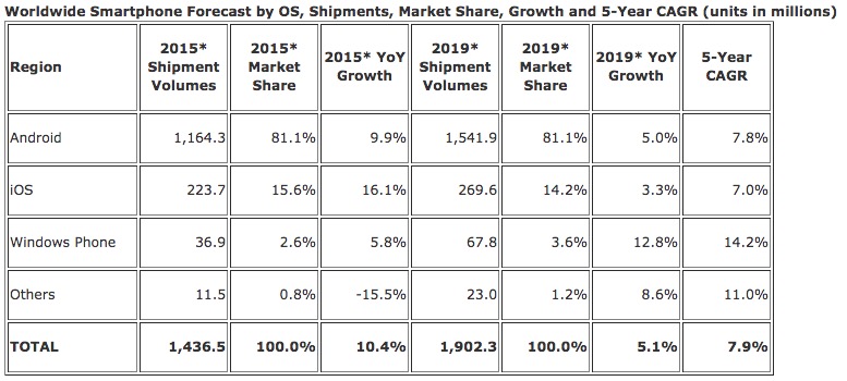 到2019年時,Android智能機的全球出貨量預計將從去年的10.6億增長至15.4億;iOS手機出貨量將從去年的1.927億增長至2.696億。IDC依舊認為,微軟的Windows Phone最多算是一個邊緣化挑戰者。