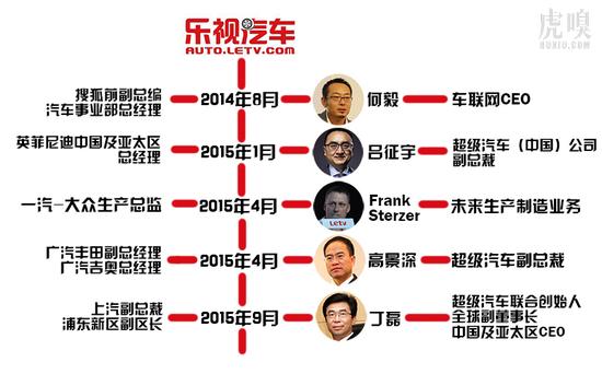 從2015年開始,樂視汽車挖角開始提速。在虎嗅目前收集到的樂視汽車高管中,有一半有外國(guó)車企經(jīng)歷。早在2013年3月原華晨寶馬營(yíng)銷高級(jí)副總裁戴雷加盟英菲尼迪中國(guó)時(shí),時(shí)任英菲尼迪中國(guó)事業(yè)部總經(jīng)理呂征宇就曾公開表示希望加入自主品牌汽車公司,在2012年銷量成績(jī)平平的情況下口出此言,姑不論其言論是否得體,如今加盟樂視也算得償所愿。