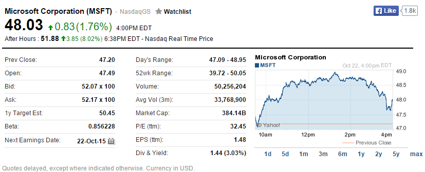 微軟股價周四在納斯達克交易所的開盤價為47.49美元,收盤時較前一個交易日上漲0.83美元,報收于48.03美元,漲幅為1.76%。在隨后截至美國東部時間18:38(北京時間23日6:38)為止的在盤后交易中,微軟股價上漲3.85美元,暫報51.88美元,漲幅為8.02%。過去52周,微軟股價最高為50.05美元,最低為39.72美元。(編譯/昷凡)