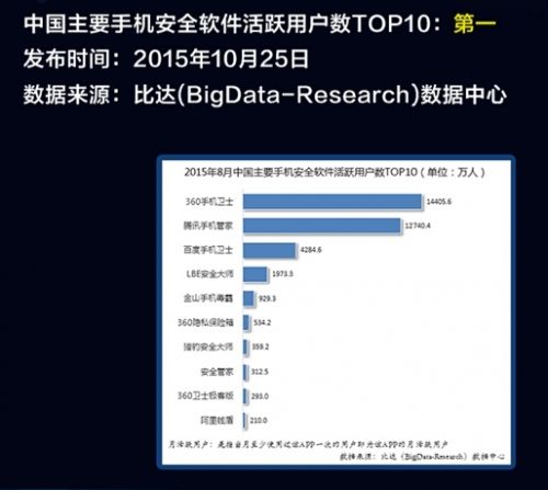 近日,專業移動互聯網研究機構比達數據(BigData-Research)發布研究報告,在2015年8月,360手機衛士憑借超過1.4億的活躍用戶排名榜首。除此,易觀智庫發布的數據也顯示,360手機衛士在9月移動安全APP排行榜中名列第一位,繼續保持在移動安全領域的領跑態勢。