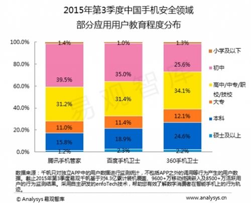此外,360手機衛士更受高學歷人群的喜愛。從易觀智庫發布的《2015年第3季度中國手機安全領域部分應用用戶教育程度分布圖》來看,360手機衛士用戶中本科及以上學歷占比較高,占26.8%。這部分人是移動支付的主力軍,對安全的要求自然也更高,因此安全功能完備的360手機衛士更受青睞。