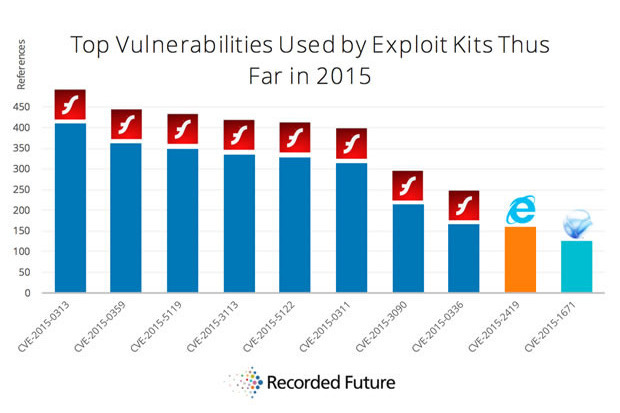 黑客攻擊工具可能會利用“幾十種其它漏洞”,但是Flash是流行黑客攻擊工具的首要目標。被利用次數最多的Flash漏洞版本是FlashPlayer16.0.0.296。盡管Adobe已經在2015年2月修復了這一重大漏洞,但是它早在2014年12月就被作為“零日漏洞”所利用。RecordedFuture稱,他們觀察到,在2015年,與一個黑客攻擊工具相關的CVE-2015-0313漏洞被提及了410次。該漏洞近期也被發現出現在Hanjuan、Angler以及Fiesta黑客攻擊工具中。