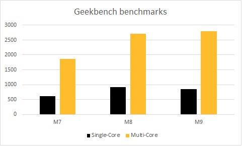 如果從跑分上來看的話,M9在多核心測試上表現更好,但是在單核性能上要稍弱于M8。最大的槽點在于,如果你拿M8和M7相比較的話,M8在性能上要遠超M7。