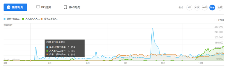 由圖中可以看到,在七月份優信大規模投放廣告前,幾家二手車商的指數都不超過4000。隨后優信發布了由11個明星組成的豪華廣告大片,百度指數開始“蹭蹭蹭”的往上漲,在10月7日的好聲音決賽播出了添加廣告后達到了頂峰。從圖中可以看到瓜子二手車和人人車也是如此。