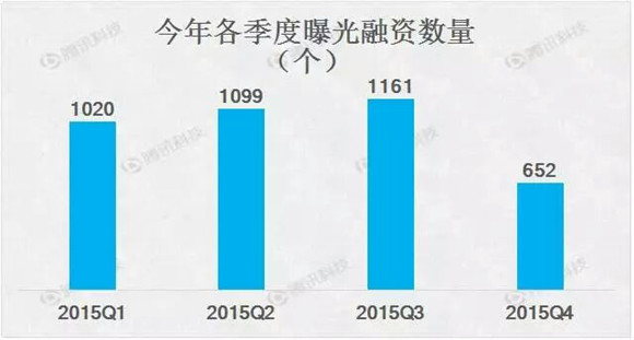 其中,2015年Q1融資案例1020個,Q2融資案例1099個,Q3融資案例1161個,Q4融資案例652個。