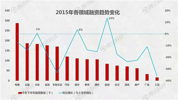 上圖顯示,比較2015年上半年和下半年的融資案例數量,只有文體、醫療、旅游領域呈現增長,分別是1%、4%和14%,其它領域均減少。