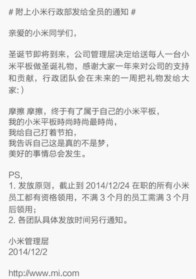 2014年,小米在圣誕節給每一位員工發了一臺小米平板作為圣誕禮物。所有在職小米員工都有資格領用(截止到12月24日),不滿3個月的員工需滿3個月后領用。此外,小米還在春節送每位員工一臺小米4作為春節禮物。
