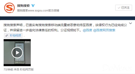 面對今日微博網友爆料,打開搜狗搜索移動客戶端被跳轉至百度搜索頁面,公然劫持搜狗搜索流量一事,百度回應暗指“搜狗搜索移動客戶端被自動跳轉至百度搜索”視頻系偽造。隨即搜狗搜索發表聲明,稱已查實有搜狗搜索移動端流量被惡意劫持至百度,搜狗已經公證侵權行為,并保留進一步追究法律責任的權利。