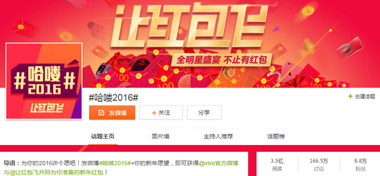 跨年期間,相關(guān)微博互動(dòng)量達(dá)1.38億,2947萬(wàn)用戶發(fā)布4414萬(wàn)條微博,整體閱讀量達(dá)到106億。微博推出的#哈嘍2016#新年許愿活動(dòng),兩天里收集了166萬(wàn)多條網(wǎng)友的新年愿望,閱讀量超過(guò)3億。
