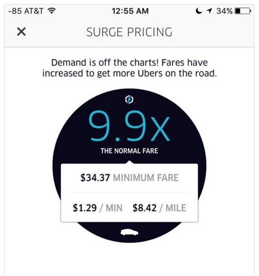 由于Uber和Lyft等專車公司都會根據供需狀況調整價格,因此當需求高企時,專車價格就會大幅上調,導致部分用戶當天支付了數百美元的車費。而與此同時,乘坐傳統出租車的人似乎并沒有陷入同樣的尷尬。