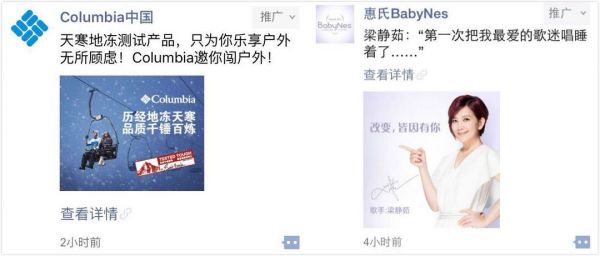 在微信朋友圈給出的廣告效果案例中,奧妙和《王朝的女人楊貴妃》的轉化率分別是 15 %和 13 %。根據《娛樂資本論》的報道,周迅和高圣遠的英菲尼迪朋友圈廣告,有 12 % 的用戶點擊了“查看詳情”。