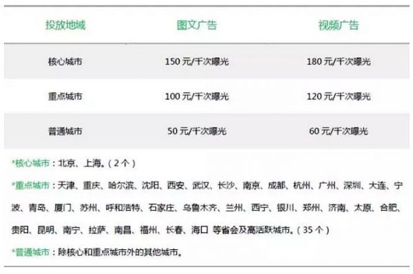 朋友圈是按照千次曝光(Cost Per Thousand, 簡稱 CPM)收費的。它只有在完整展示了之后才會被扣費。而且朋友圈廣告是按地域層級分的,這次調整之后的詳細收費標準如下: