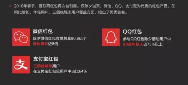據數據顯示,除夕當天共有2900萬張紅包照片發出,紅包照片互動總次數超過1.92億次。其中,90后是發紅包主力,共發送25.88億次。最喜歡發紅包的省份是廣東,江蘇和浙江緊隨其后,最喜歡發紅包的前三個城市是北京、深圳和廣州。