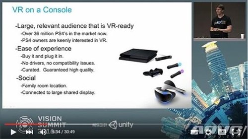 相比其他VR設備,以PS4為母機的PSVR的優勢又在哪兒?在AR/VR遠景峰會上,索尼的RichardMarks就PSVR的魅力發表了演講,闡述了PSVR的市場定位及魅力。