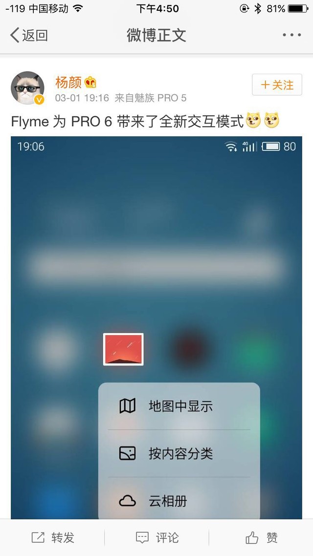 前段時間魅族楊顏在微博上透露稱,魅族Pro6將會配備壓感屏幕,并且魅族定制的Flyme系統也會為壓感屏幕提供相關的軟件支持,同時放出了一張魅族Flyme系統中,類似3DTouch呼出應用圖標任務菜單的一張截圖。