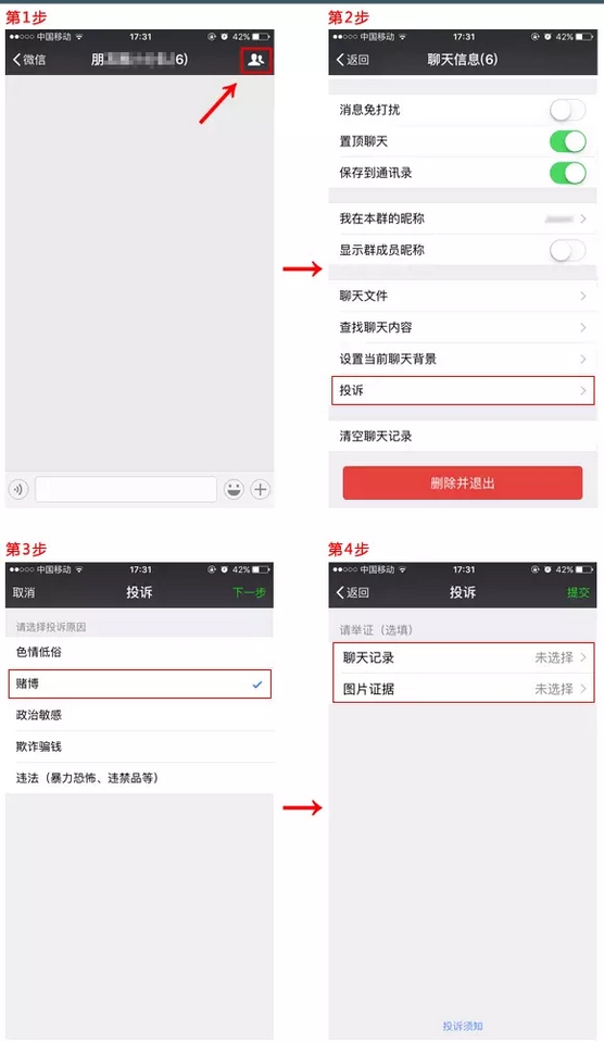 同時,我們也呼吁各位用戶與微信安全團隊一起共同構筑健康、綠色的網絡環境:若在使用微信過程中,發現有利用群功能進行賭博行為,可參考以下指引通過“投訴”向我們反饋。我們將持續對此類違法違規行為堅決打擊。