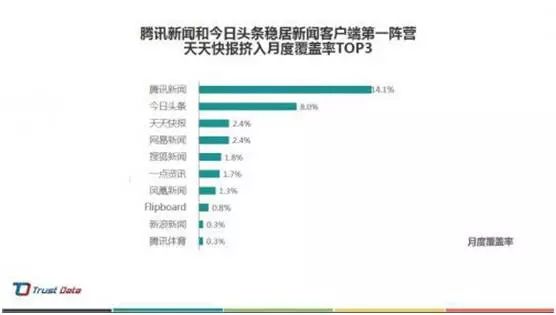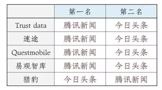 但從2015年下半年以來,這片江湖再次風(fēng)起云涌,格局突變,逐漸形成騰訊新聞和今日頭條兩強(qiáng)之爭(zhēng)的局面。如果你仔細(xì)觀察TrustData、速途、QuestMobile、獵豹、易觀智庫(kù)等機(jī)構(gòu)發(fā)布的有關(guān)資訊客戶端用戶規(guī)模的排名,基本上都將騰訊新聞和今日頭條列為前兩名,漸成“兩強(qiáng)相爭(zhēng)”之勢(shì)。