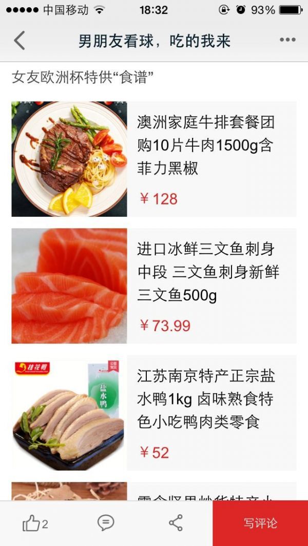 比如針對(duì)歐洲杯的“男朋友看球,吃的我來(lái)”,點(diǎn)進(jìn)去之后就會(huì)看到一些簡(jiǎn)單的文字介紹和食譜,有三文魚(yú)、牛排等,上面標(biāo)注了價(jià)格,點(diǎn)擊圖片或者文字,就能跳轉(zhuǎn)到相應(yīng)的購(gòu)買頁(yè)面。還有針對(duì)畢業(yè)季賣旅行相機(jī)、父親節(jié)潮爸清單的帖子。