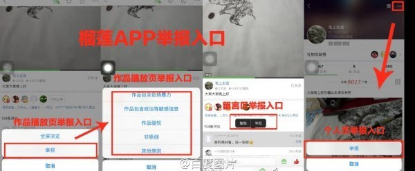 2、榴蓮app擁有明確的舉報渠道,報道描述并非事實。為保證廣大用戶的使用體驗,榴蓮APP在在留言區(qū)、內容播放區(qū)、個人中心等多個區(qū)域,均設有投訴舉報入口,用戶可通過上述區(qū)域的“舉報”按鍵進行投訴。對于相關投訴,經(jīng)核查屬實后將在第一時間下線處理;對于違法違規(guī)帳號,一經(jīng)發(fā)現(xiàn)將全部封號處理。故報道中所描述的“沒有人工投訴和舉報程序”并無依據(jù);(如圖所示)