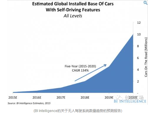BI Intelligence做的一份調查報告顯示(如圖所示),在未來的五年內,全球擁有無人駕駛系統的汽車將會大幅度提升。