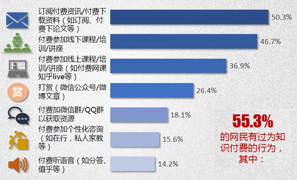 線上課程是除了付費(fèi)下載外,用戶(hù)接受程度最高的模式:消費(fèi)有償分享的知識(shí)的滲透率在網(wǎng)民中超過(guò)了一半,達(dá)55.3%,仍然有很大的提升空間。在有過(guò)知識(shí)付費(fèi)行為的人中,訂閱付費(fèi)資訊/付費(fèi)下載資料的人占比最高,付費(fèi)參加線下課程/培訓(xùn)/講座滲透率其次,接下來(lái)是為線上課程/培訓(xùn)/講座付費(fèi)(37%)。個(gè)性化咨詢(xún)和付費(fèi)聽(tīng)語(yǔ)音的滲透率最低。