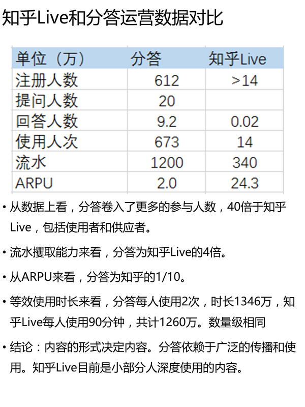 知乎Live目前的流水增速,遠(yuǎn)低于分答。按每年1800萬(wàn)計(jì)算,按知乎估值18億rmb計(jì)算,知乎Live提成10%,則Price/earning=1000。