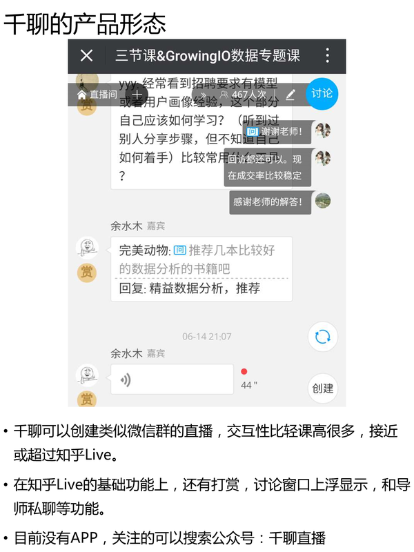 工具化的競(jìng)品已經(jīng)有一些,千聊,紅點(diǎn)。千聊和知乎Live的上課場(chǎng)景形態(tài)極為類(lèi)似。