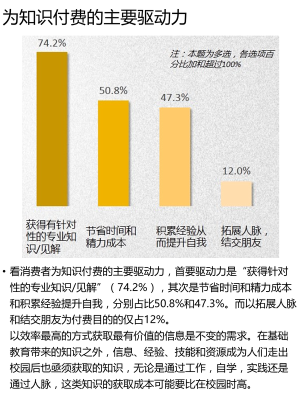 從上圖來(lái)看,專(zhuān)業(yè)性,高效和自我提升,是促使知識(shí)付費(fèi)的主要驅(qū)動(dòng)力。