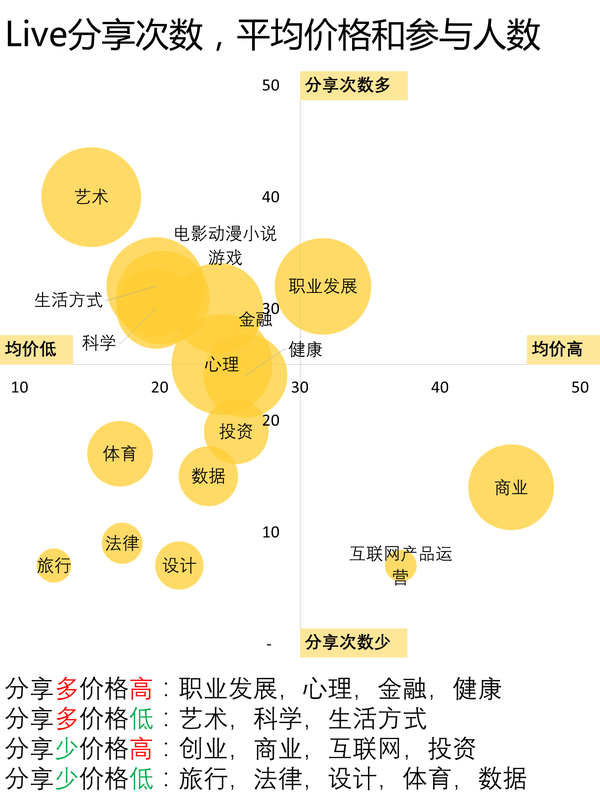另一方面,目前知乎Live的形式?jīng)Q定在非娛樂(lè)專(zhuān)業(yè)領(lǐng)域(數(shù)據(jù),法律,創(chuàng)業(yè),互聯(lián)網(wǎng),設(shè)計(jì)等專(zhuān)業(yè)領(lǐng)域)的分享次數(shù)和參與人數(shù)都較少。和職業(yè)發(fā)展和商業(yè)不同(這兩個(gè)領(lǐng)域更偏向于經(jīng)驗(yàn)和方向指引),這些領(lǐng)域需要知識(shí)鋪墊(同時(shí)專(zhuān)業(yè)術(shù)語(yǔ)較多),和日常生活離的較遠(yuǎn)(工具型較強(qiáng),結(jié)果導(dǎo)向),分享者應(yīng)該考慮如何降低參與門(mén)檻,以趣味性和相關(guān)性更強(qiáng)的角度引入話題。