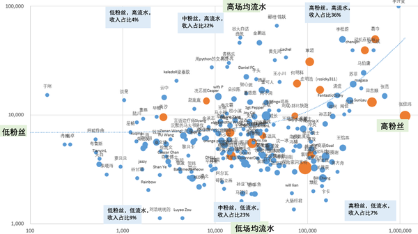 知乎大V的分享次數(shù),具體來(lái)看為下圖,橫軸為粉絲數(shù)量,縱軸為場(chǎng)均收入。圓圈大小代表分享次數(shù),分享大于3的用橙色圈出來(lái)。(平均每位大V分享1.8次。)