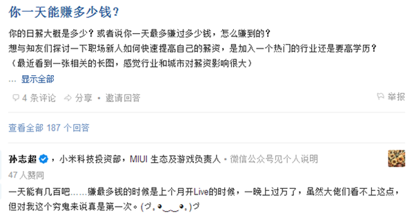 這里引用一個(gè)我關(guān)注大V的調(diào)侃言論:雖說(shuō)是調(diào)侃,但是過(guò)萬(wàn)收益還是很impressive的。起碼,知乎讓人直接通過(guò)知識(shí)分享賺到錢(qián)了,而不是辛辛苦苦寫(xiě)公眾號(hào)廣告轉(zhuǎn)化,賣(mài)東西等等。
