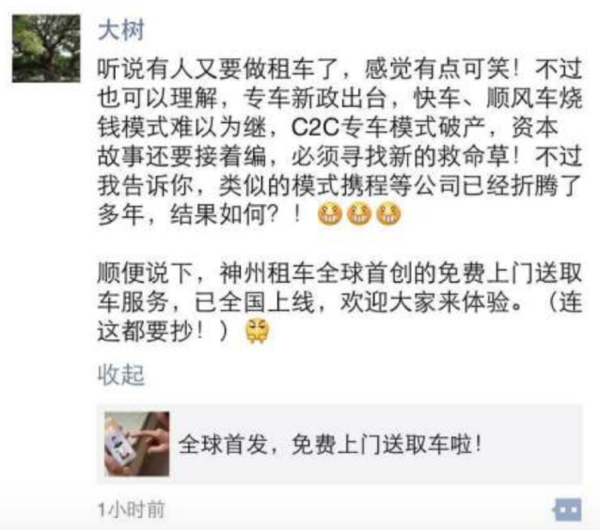 針對滴滴進軍租車領(lǐng)域,神州租車主席陸正耀在朋友圈中對此發(fā)表點評:“聽說有人又要做租車了,感覺有點可笑!不過也可以理解,專車新政出臺,快車、順風車燒錢模式難以為繼,C2C專車模式破產(chǎn),資本故事還要接著編,必須尋找新的救命草!不過我們告訴你,類似的模式攜程等公司已經(jīng)折騰了多年,結(jié)果如何?!”