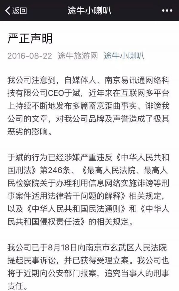 途牛旅游網(wǎng)昨日在公司官方微信公眾號(hào)“途牛小喇叭”發(fā)布公告,自媒體人、南京易迅通網(wǎng)絡(luò)科技有限公司CEO于斌多次發(fā)布歪曲事實(shí)、誹謗途牛的文章,故對(duì)于斌提起民事訴訟。