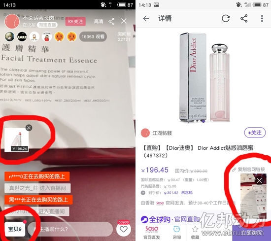 據億邦動力網了解,全球購買手會直播購買商品的整個過程,還會根據用戶的留言,詢問柜臺業務員相關問題等。用戶點擊直播間左方的圖片或者左下角的“寶貝”,可直接跳轉至購買頁面,同時亦能點擊購買頁面右下角的直播畫面回到直播間。