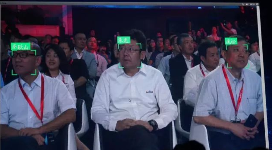 在圖像識(shí)別環(huán)節(jié),鏡頭對(duì)準(zhǔn)臺(tái)下第一排的嘉賓,當(dāng)攝像頭采集到張亞勤等人的臉時(shí),會(huì)在其上面標(biāo)注出他的名字。