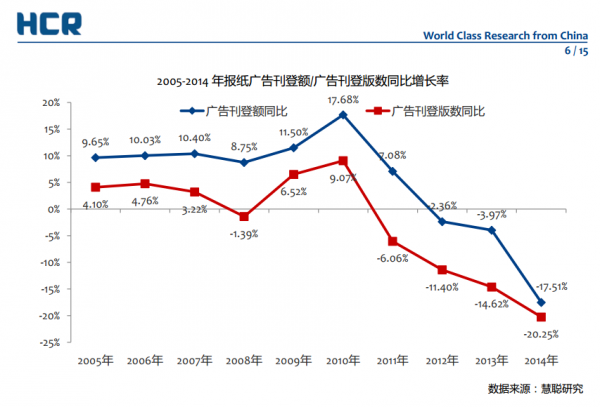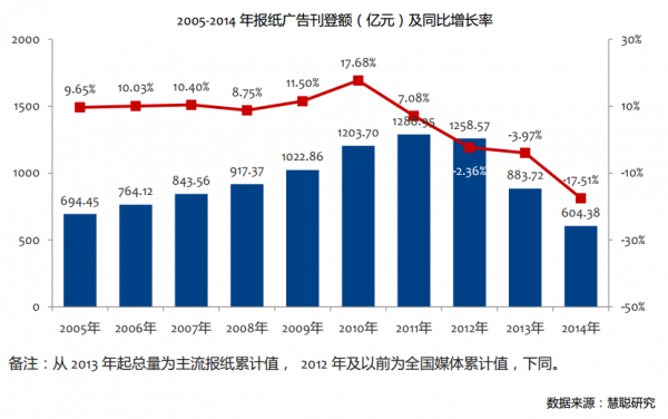 2014年,互聯(lián)網(wǎng)和新媒體的發(fā)展使傳統(tǒng)媒體的經(jīng)營遭受了前所未有的沖擊,年初海爾集團發(fā)函稱,今后將不在傳統(tǒng)媒體投放任何形象廣告,而其并非國內(nèi)唯一嘗試脫媒的大企業(yè)。由中國廣告協(xié)會報刊分會、央視市場研究(CTR)媒介智訊發(fā)布的《中國報紙廣告市場2014年度報告》中顯示,2014年報紙廣告刊登額同比2013年大幅下降17.51%。大量報紙停刊,包含原解放日報報業(yè)集團下屬《新聞晚報》、《天天新報》等,大批媒體中堅力量出走,這樣的社會大環(huán)境下,傳統(tǒng)媒體轉(zhuǎn)型迫在眉睫。