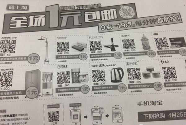 另一個重要的推手是阿里,同年4月通過聯(lián)合六大城市12家“都市報”,使用二維碼分成模式的“碼上淘”業(yè)務(wù),將媒體作為電商行業(yè)的營銷入口。媒體本身不用關(guān)心電商行業(yè)中供應鏈、物流和支付的三大環(huán)節(jié),而利用原版面增加二維碼信息,也不會增加采編和印刷成本,只要做好傳播即可,這樣的操作手法短期內(nèi)即可攤薄成本,提升利潤率。
