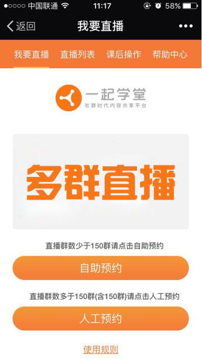 第二步:進入一起學堂,點擊菜單底部“社群工具-多群直播”,即可預約微信多群直播工具。