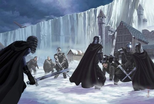我是黑暗中的利劍,長城上的守衛。我是抵御寒冷的烈焰,破曉時分的光線,喚醒眠者的號角,守護王國的堅盾。我將生命與榮耀獻給守夜人。