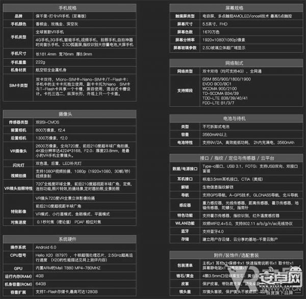中國深圳一家叫做保千里電子的公司開發了兩款支持360度全景視頻拍攝的智能手機,它們分別是保千里打令VR智能手機的精英版和至尊版。兩款手機的主要區別在于外形設計和外殼用料,精英版較為普通,而至尊版模仿Vertu使用了黃金和皮革材質。配置方面,兩款手機都配備前后各1300萬像素的廣角攝像頭(VR攝像部分,普通攝像頭部分則是前800萬,后1300萬),兩個攝像頭的畫面可以在0.02秒內實時拼接成為全景畫面。手機使用了2.5GHz主頻的聯發科Helio X20處理器,4GB內存和3560mAh的電池,其屏幕采用5.5英寸FHD(1080p) AMOLED顯示屏。接口也是最新的USB-Type-C。