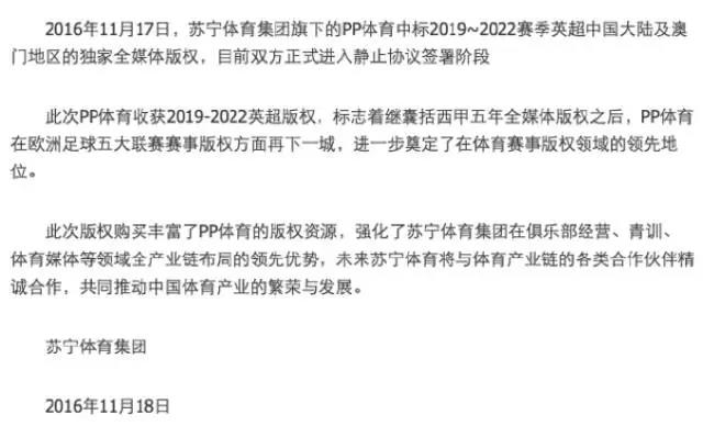 今天下午,蘇寧體育集團發布公告,正式官宣了這一消息。這份公告中同樣并未提及價格,而語焉不詳的“PP體育”又引發了一輪新的猜測。