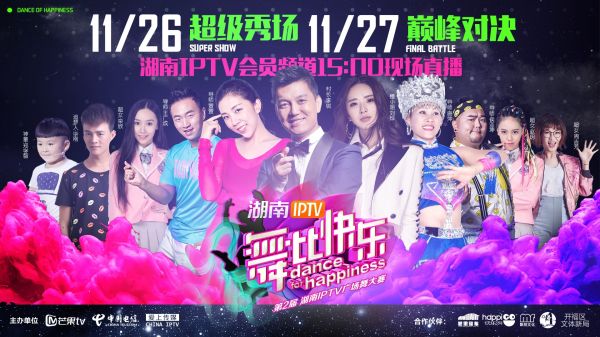 2016湖南IPTV第二屆“舞比快樂”廣場舞大賽群星璀璨,“最暖村長”李銳、“懂小姐”劉燁、“廣場舞小王子”王廣成、世界排舞冠軍唐萍、“廣場舞小天后”萱萱、“魅力達人”侯亞坤、“廣場舞小神童”鄭學智、“剛剛舞創始人”畢剛、超級女聲助力決賽,11月26日超級秀場、11月27日巔峰對決,湖南IPTV會員頻道(標高清40/IPTV+50)15:00現場直播!
